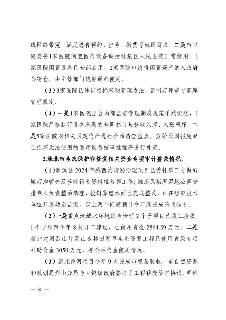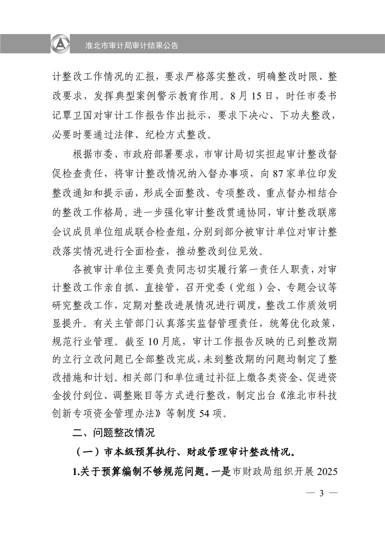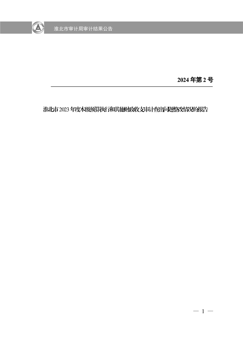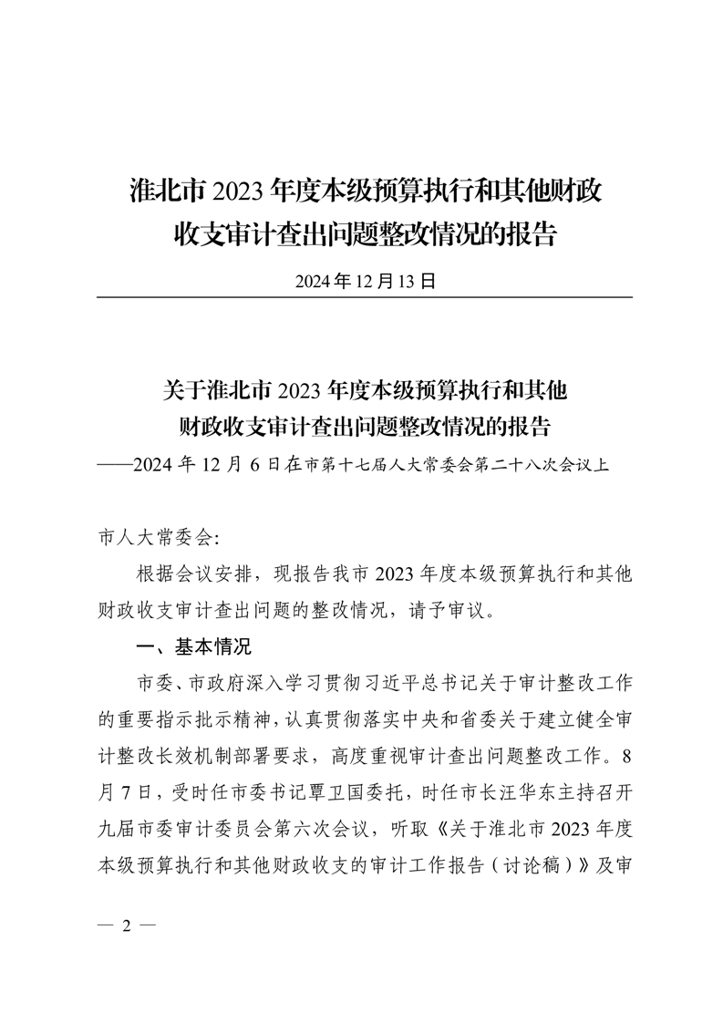 3044永利集團審計結果公告2024年第2號:淮北市2023年度本級預算執行和其他財政收支審計查出問題整改情況的報告