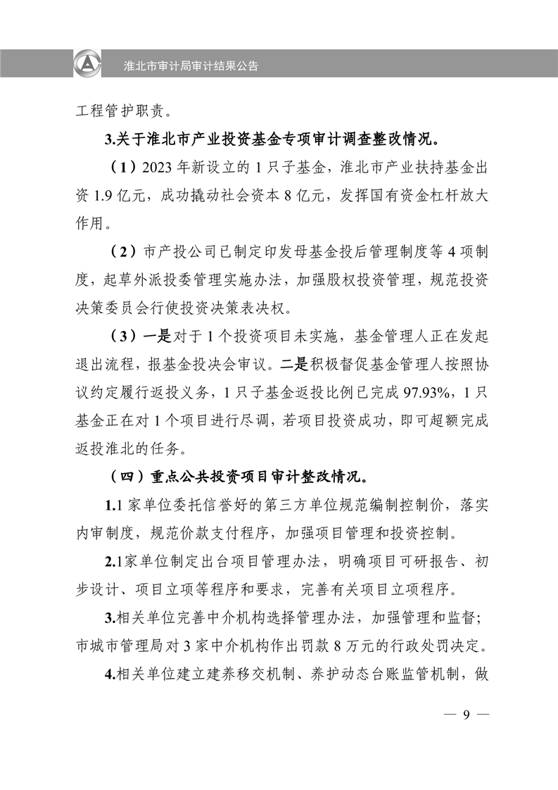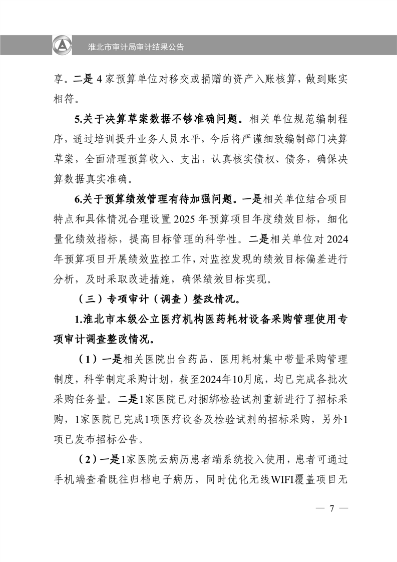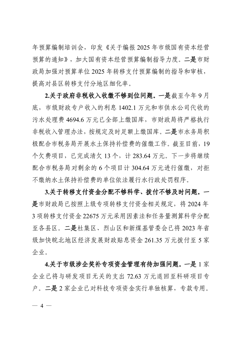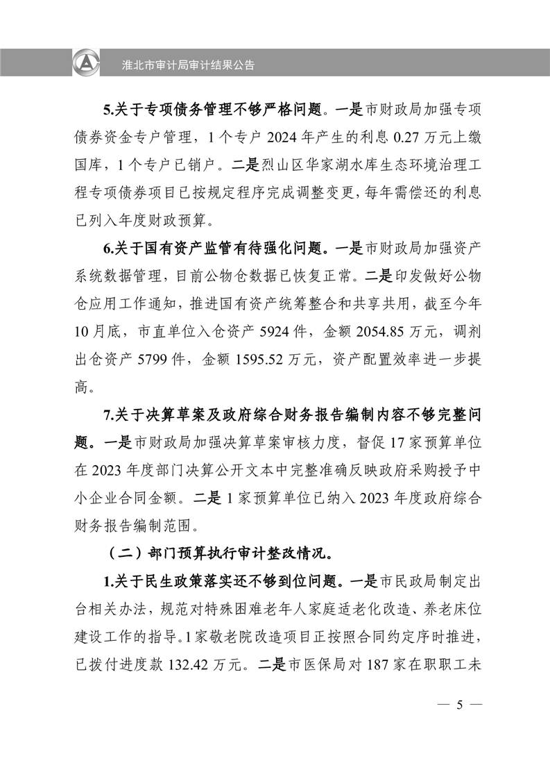 3044永利集團審計結果公告2024年第2號:淮北市2023年度本級預算執行和其他財政收支審計查出問題整改情況的報告