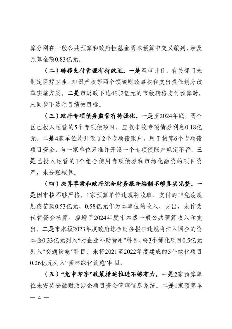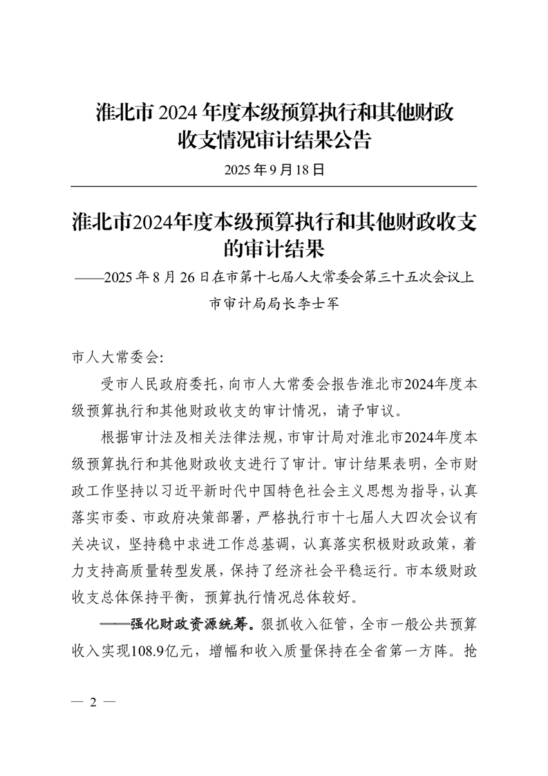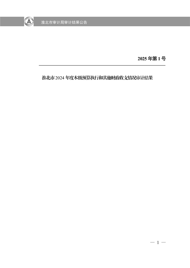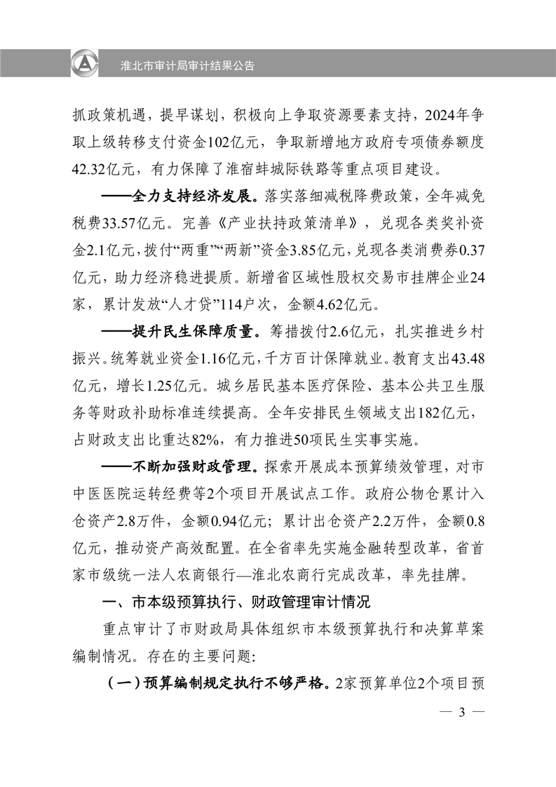 3044永利集團審計結果公告2025年第1號:淮北市2024年度本級預算執行和其他財政收支情況審計結果